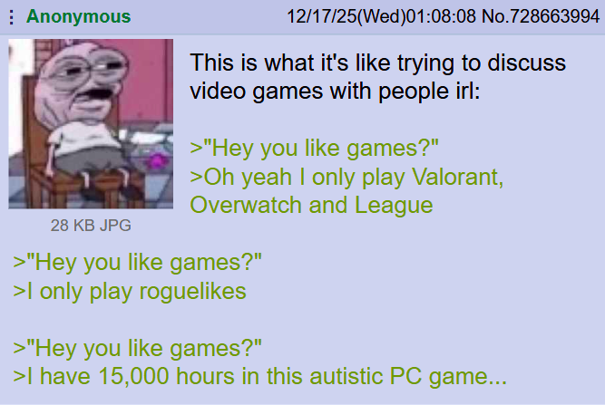 🍹Early to RISA 🧉@sh.itjust.worksM to Greentext@sh.itjust.works · 6 days agoAnon wants to talk about video gamessh.itjust.worksimagemessage-square237fedilinkarrow-up1749