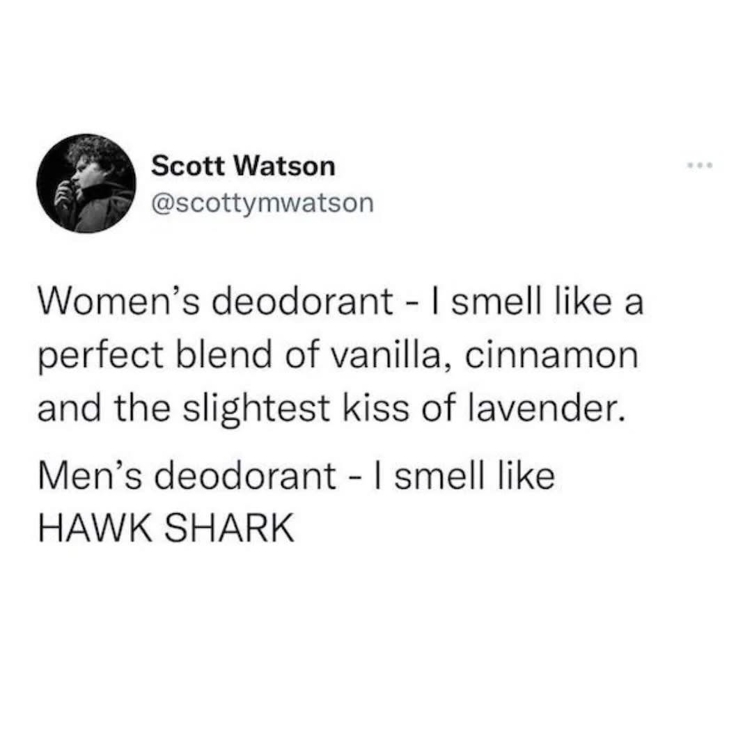 Crazy everyone here uses women’s deodorant? Over here it’s the opposite. My wife discovered long ago that she likes mine way more than hers since its bigger, lasts longer, and seems to work better. Im not a fan of this, but what can i do. So we both use either old spice fresh or old spice sport.