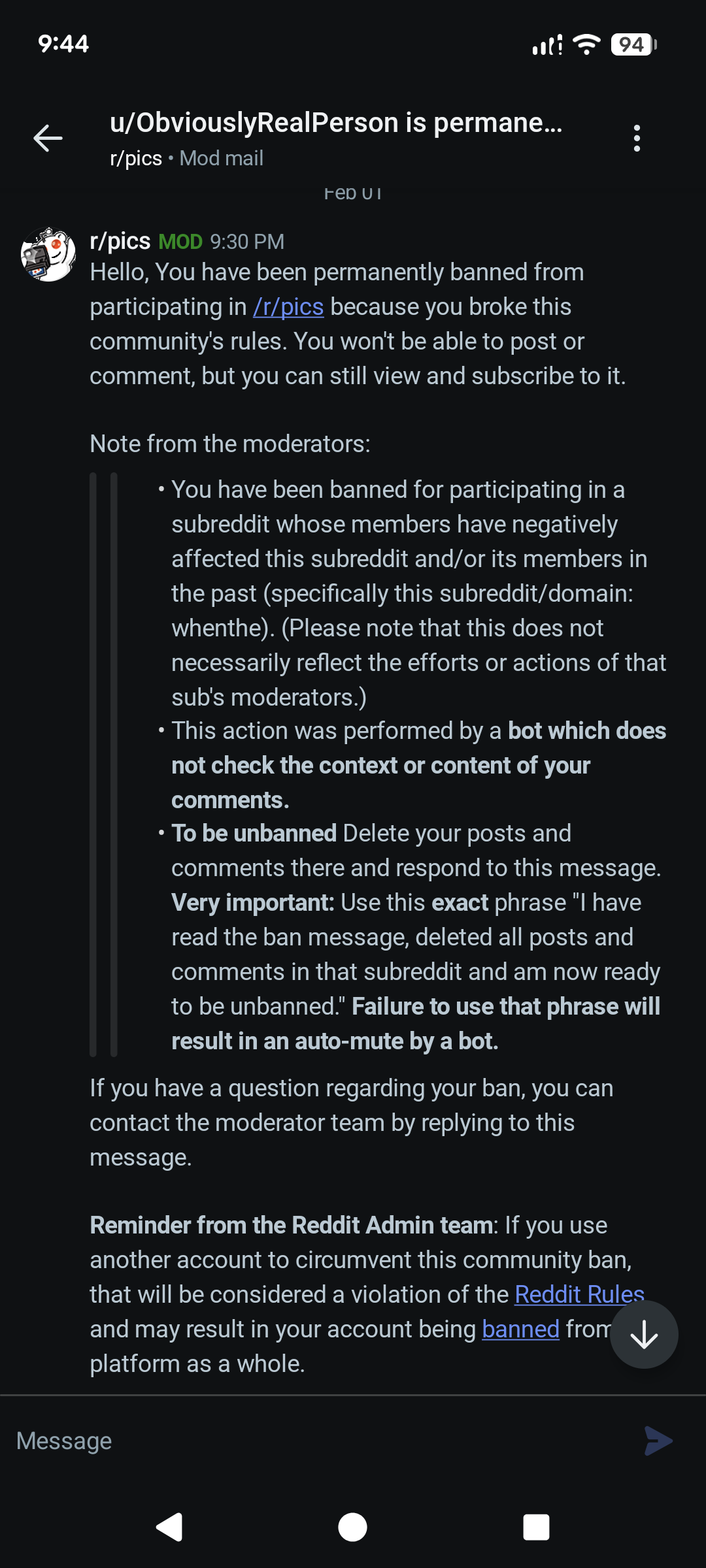 HappySkullsplitter@lemmy.world to Reddit@lemmy.world · 2 months agoGetting banned from r/pics randomlylemmy.worldimagemessage-square24fedilinkarrow-up199file-text