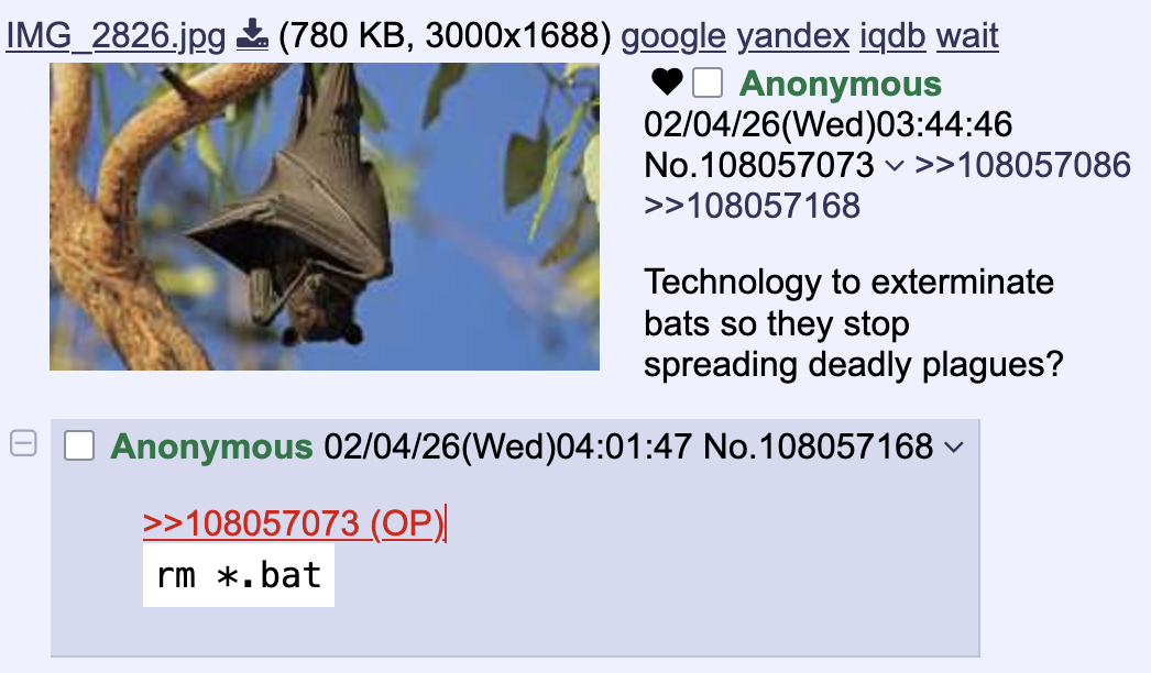Yeah, but… I recently watched a documentary about a bunch of deadly diseases and except for one spread by mice in the US, all the viruses used bats as hosts. So I think it’s understandable that some people feel ambiguous about bats.