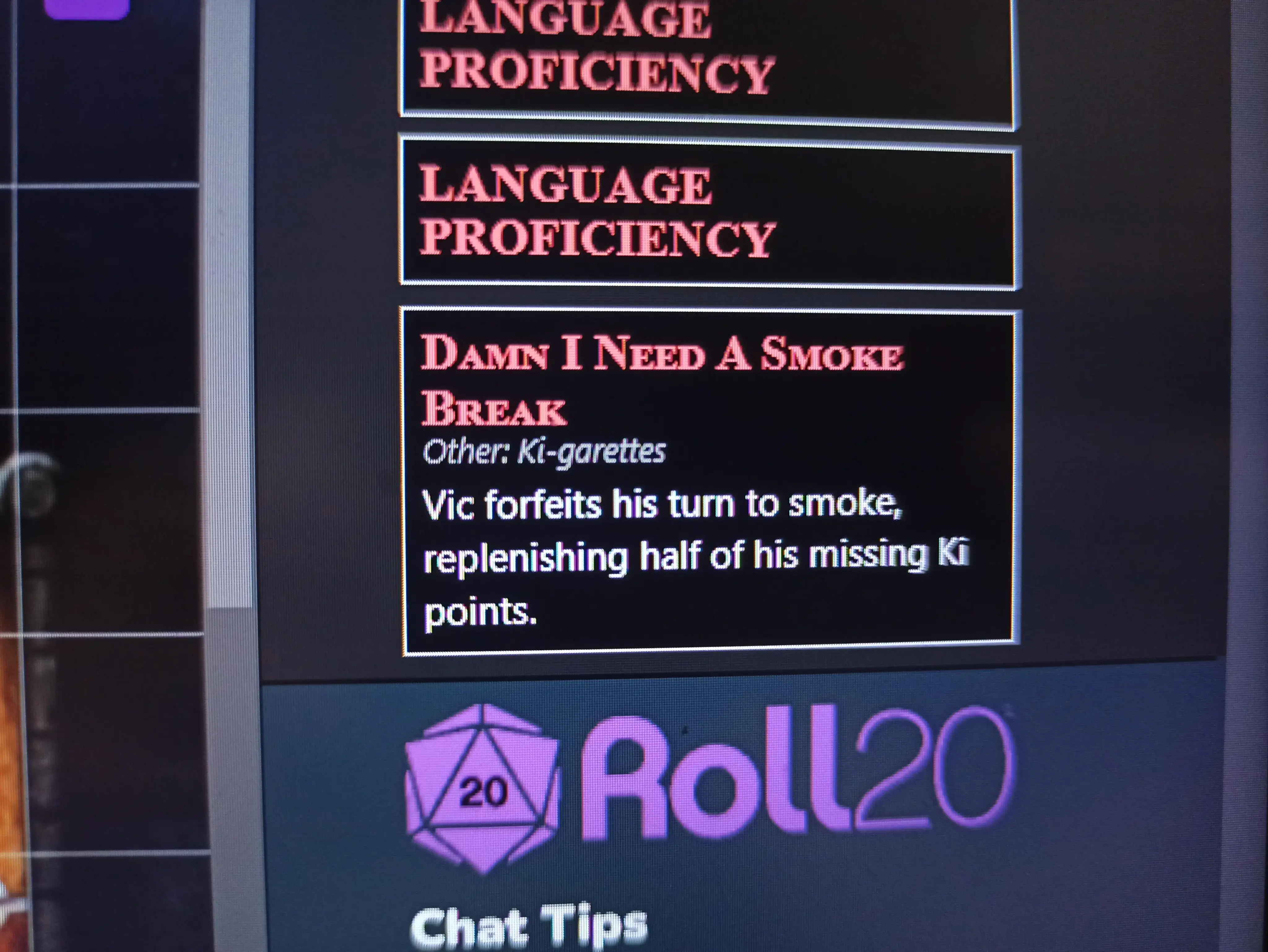 This is peak table-flavor. Sacrifice your action to smoke and half your Ki comes back? Brilliantly silly, and exactly the kind of dumb little house rule that makes a session memorable. I want this printed on a character sheet as a feat.