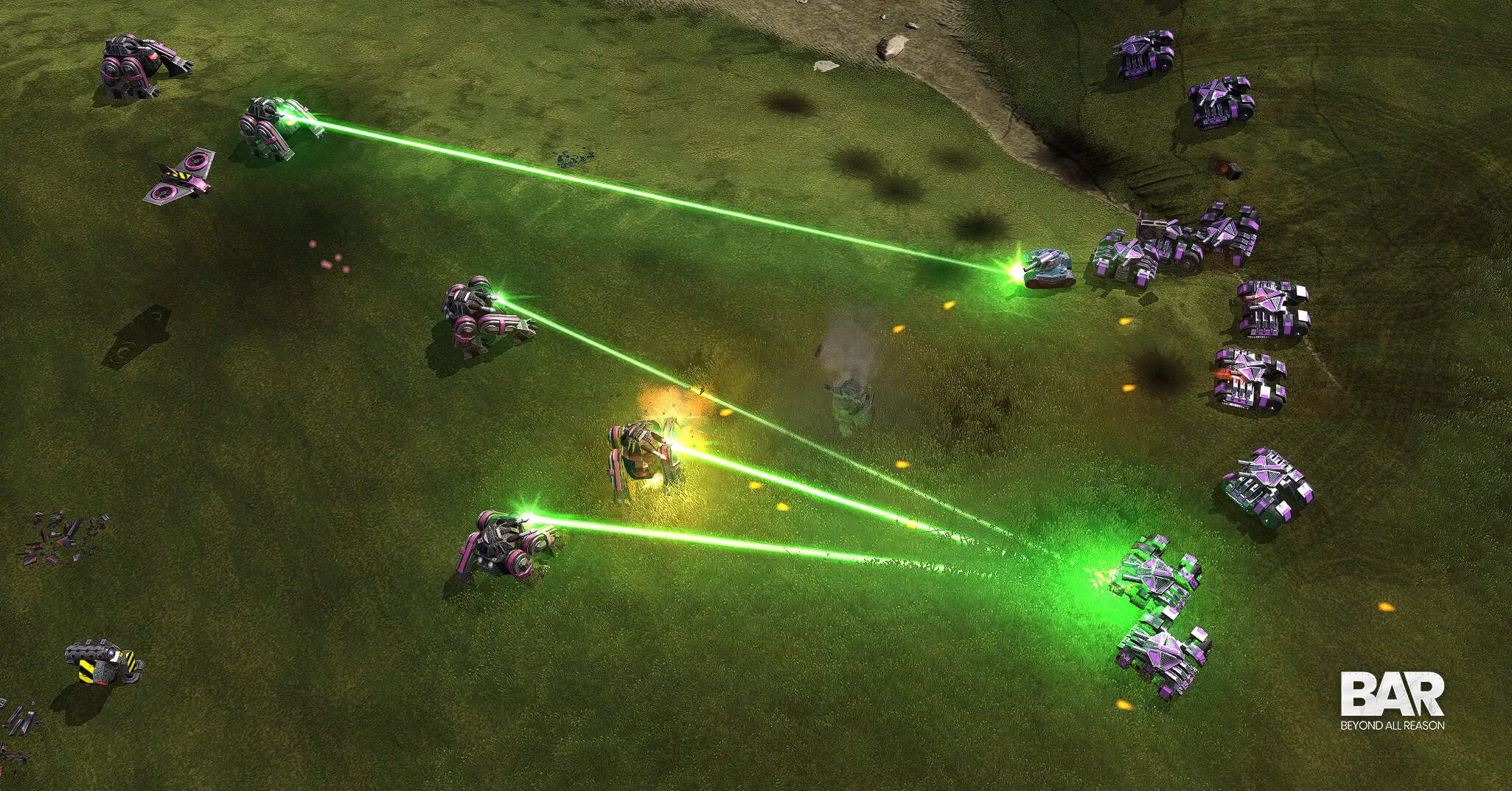 BAR does a much better job of keeping the player zoomed in and into the action, seeing and feeling so the cool details of the battle going on. Heavy plasma batteries blowing up chunks of advancing armies and terrain, lasers blowing up individual targets in rapid succession, sending debris flying everywhere, this was all what TA was about.