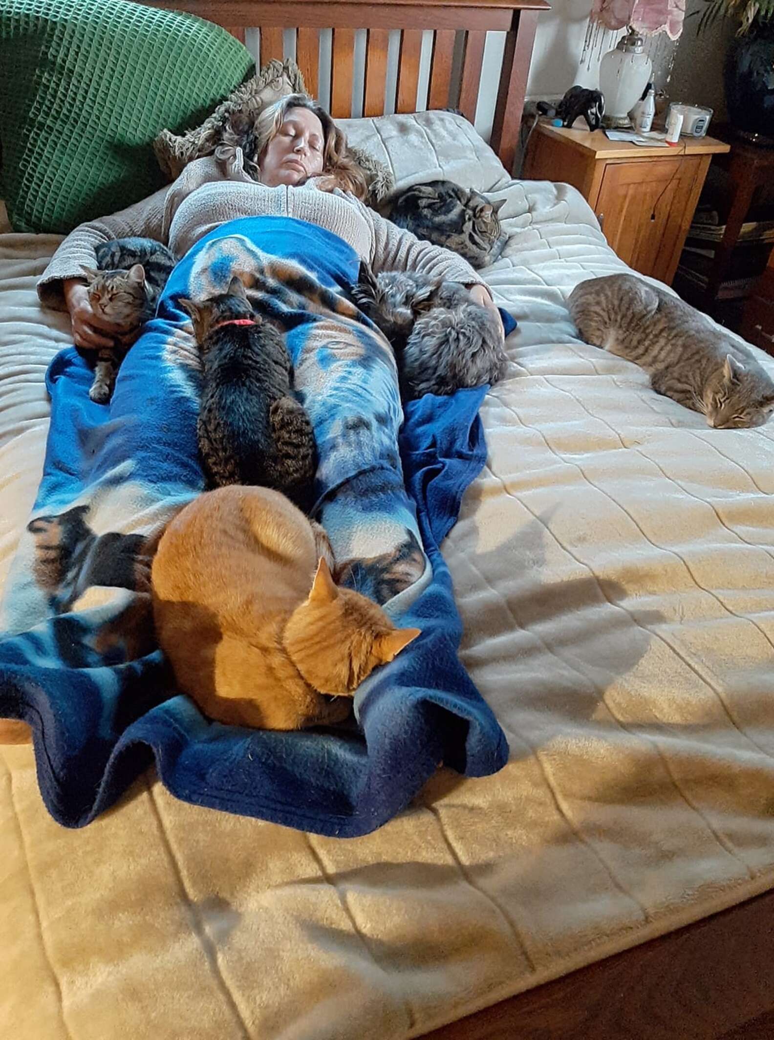 Normally, the cats won’t all cuddle with their mom at the same time … but when they realized she was sick, they knew she needed some extra love and figured out exactly what to do.