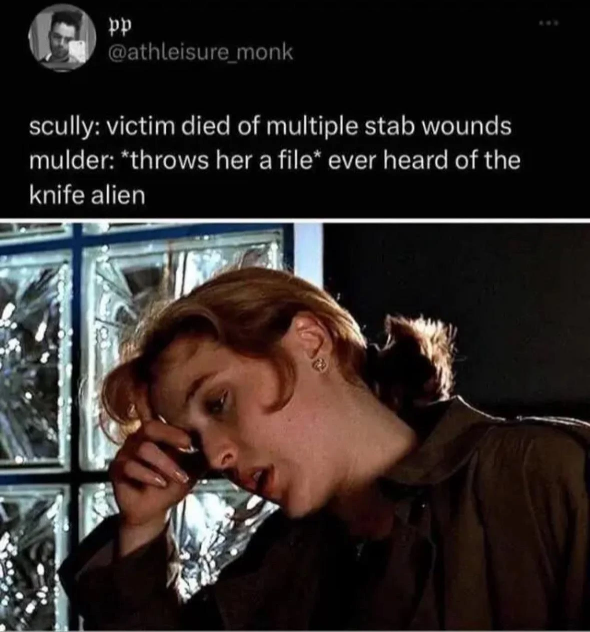 I’ve seen this meme so many times and it fucking never gets old because it really does encapsulate how absurd your standard X-Files episode is.