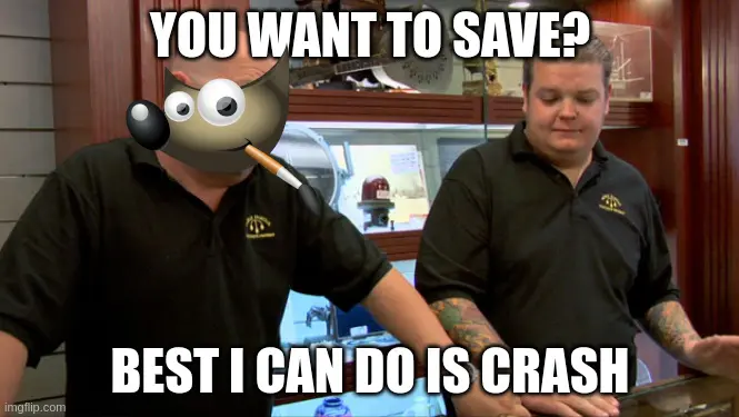 Huh. I have never had Gimp crash on me once in fifteen years. I only use it to make shitty memes and fake my tax returns though so I guess YMMV.