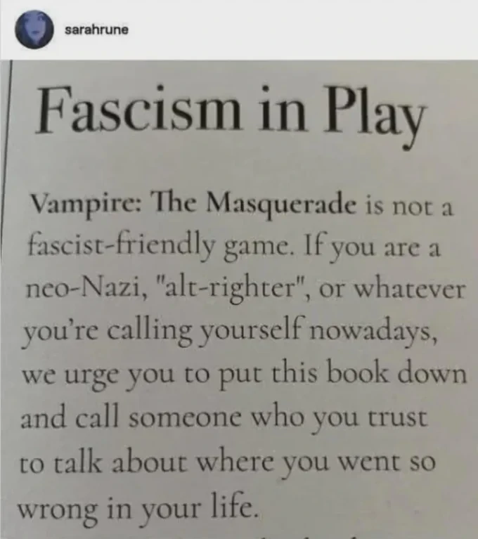 In My experience VTM players trend fascist because the game encourages you to accept the Camarilla’s fascist idolisation of humanity.