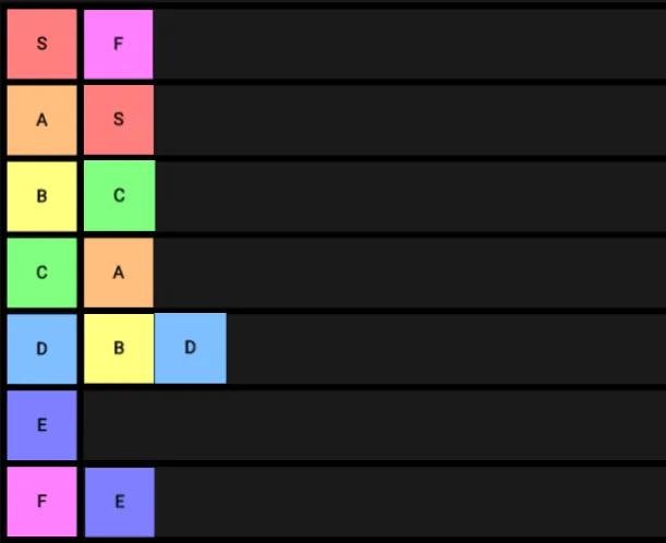 Anything after D is usually superfluous so i would actually put F in E tier or D tier