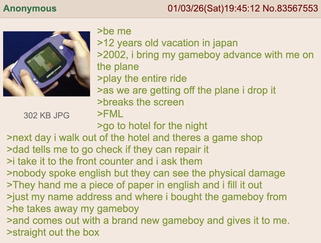 The most unrealistic thing about this post is the idea that you might drop a GBA and break it’s screen. Those things were practically indestructible.