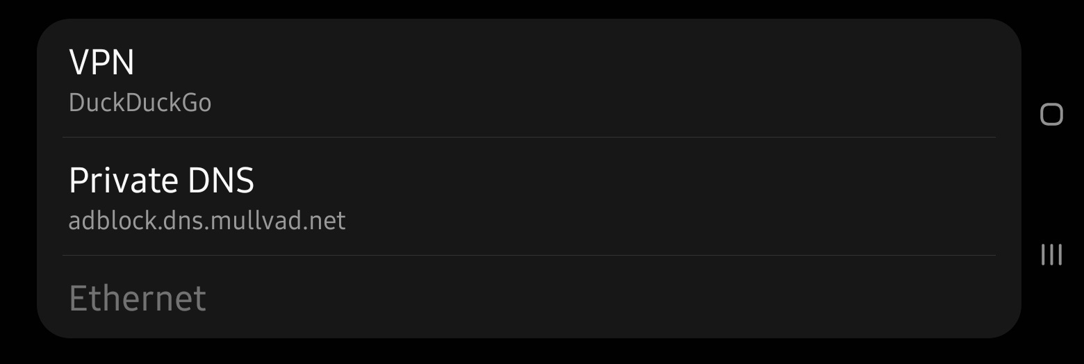 Mullvad Private DNS (adblock) - filters at the DNS level, so many ad/tracking/malicious domains never resolve in the first place. Works across the whole device without root. Free to use with ZDR policy.