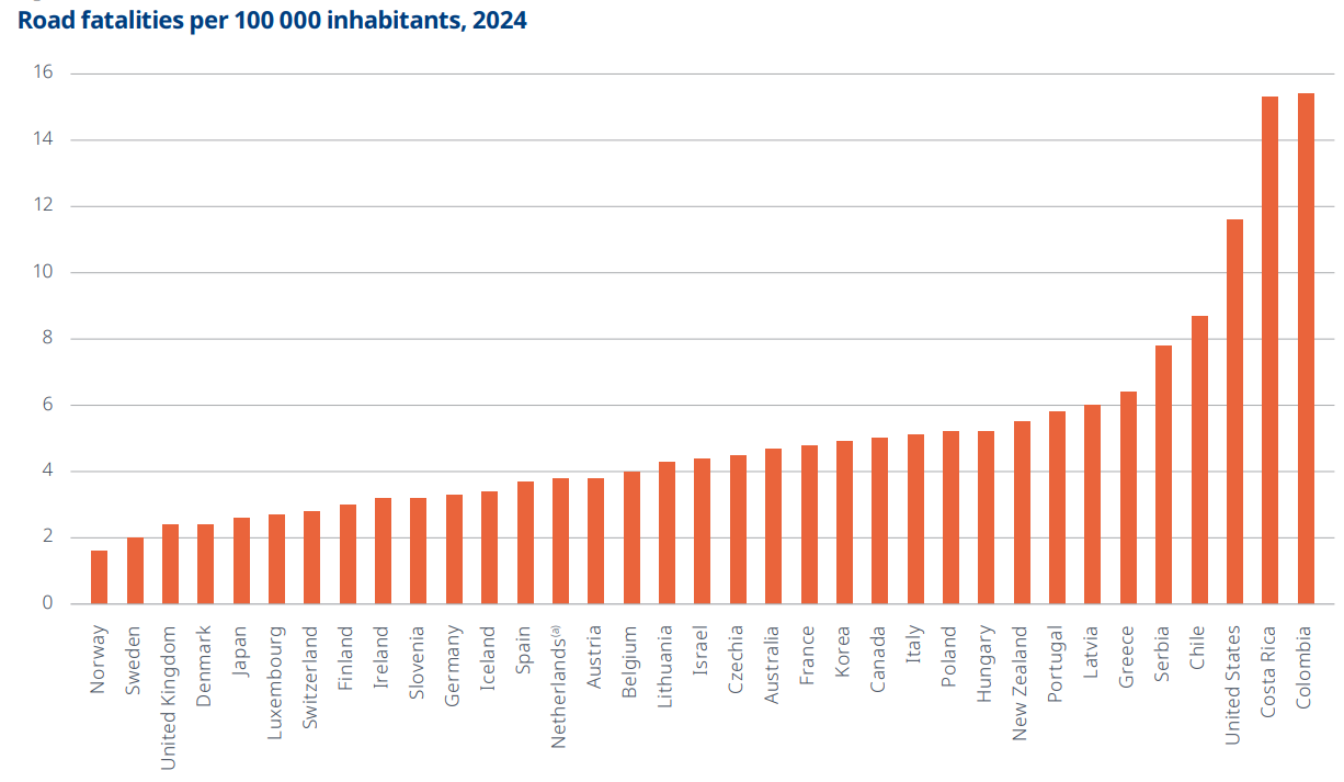 I’d imagine if instead of per 100000 inhabitants, we used per million kilometers driven, we’d see more comparable numbers across countries. US has far more vehicles per capita than Denmark where I’m living. I’d also imagine people spend longer time in traffic in US.