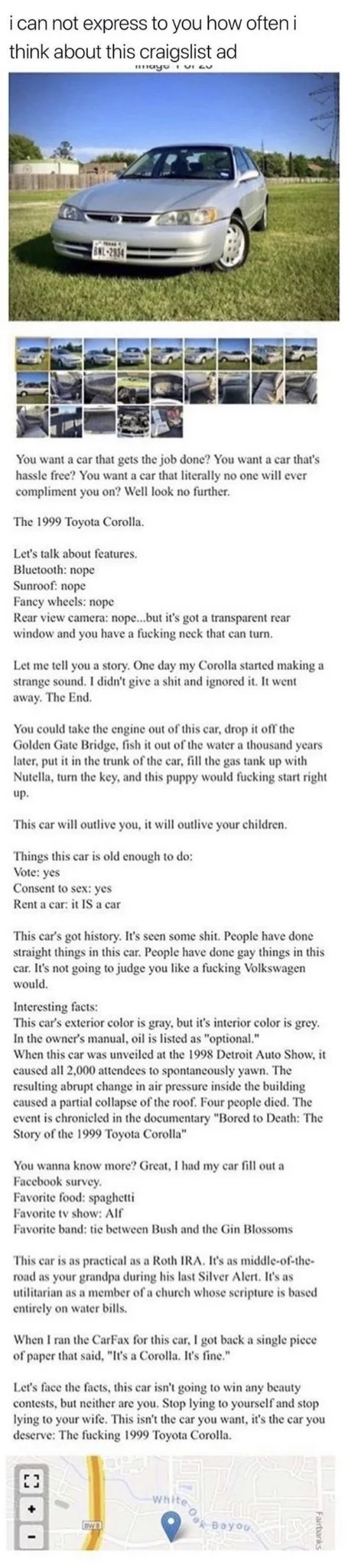 Lets face the facts, this car isn’t going to win any beauty contests, but neither are you. Stop lying to yourself and stop lying to your wife. This isn’t the car you want, it’s the car you deserve: The fucking 1999 Toyota Corolla.