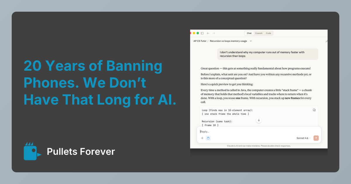 I co-teach AP Computer Science A through Microsoft’s TEALS program. The classroom runs on Chromebooks, Google Classroom, and code.org (AWS). Corporate infrastructure top to bottom. This year I added an AI tutor. That’s apparently the controversial part.