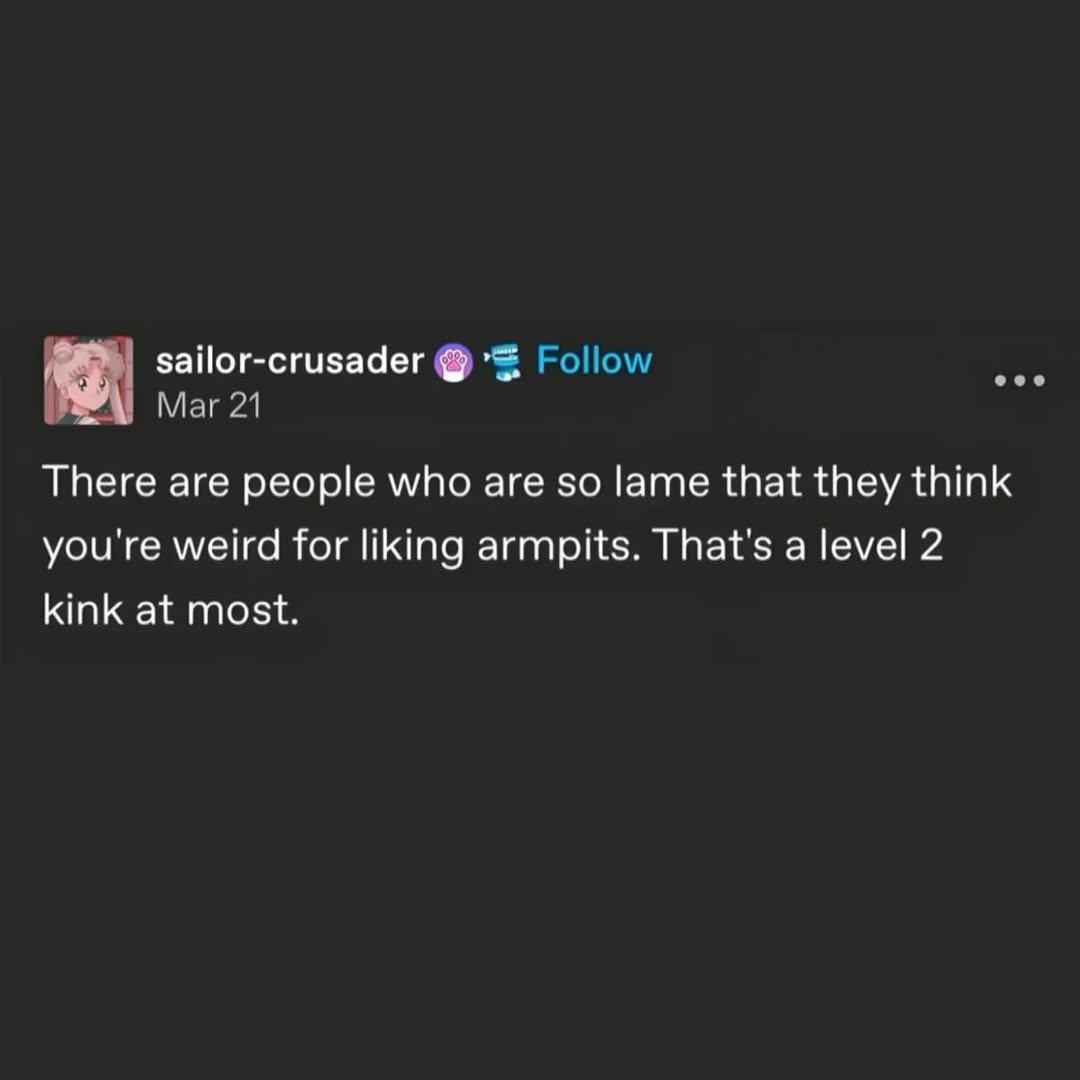 I’m not into pits despite loving some mild sweaty smell. And no judgment to those who are, but it was very disappointing the one time I posted a pic of my boobs and just got people commenting on my pits.