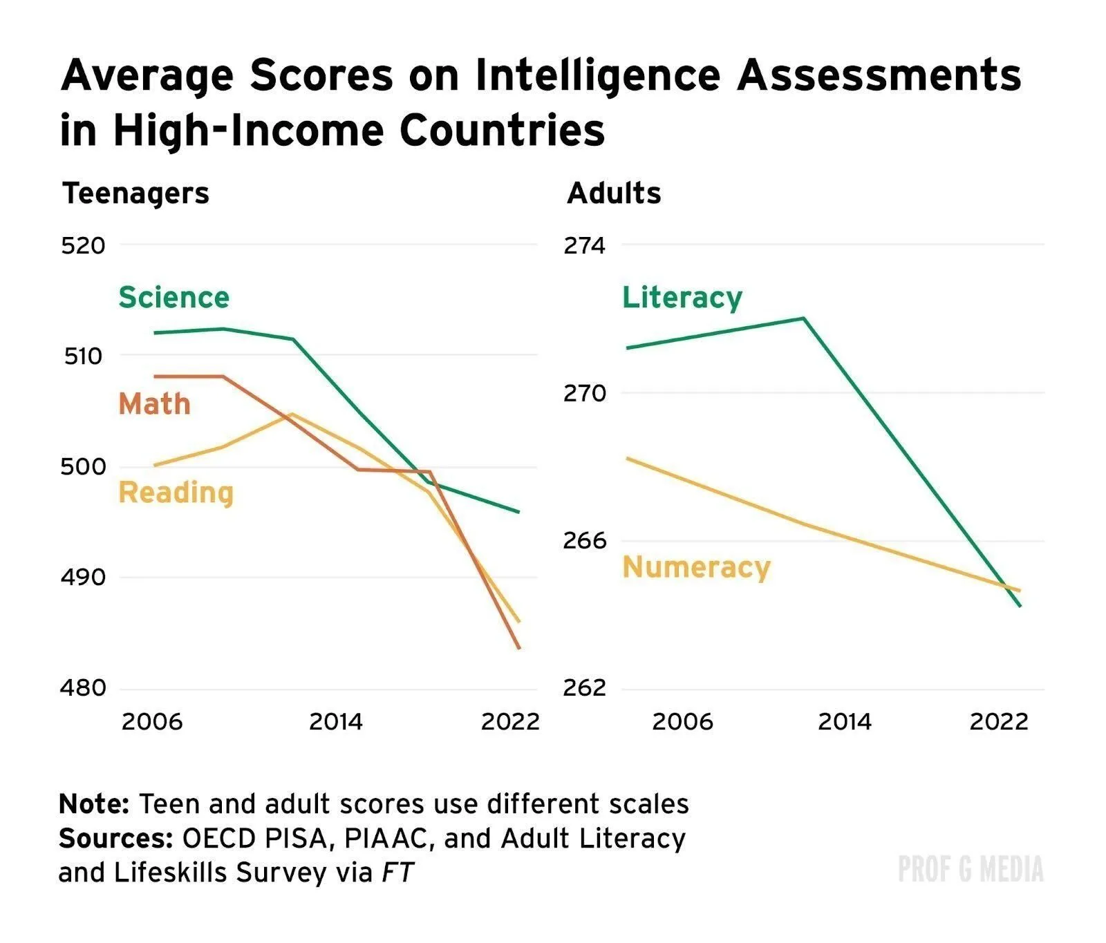This data is not beautiful. What’s the cause? Seems odd, affecting both students and adults, so it’s like knowledge decay as well as poorer uptake of knowledge. Social media and device usage?