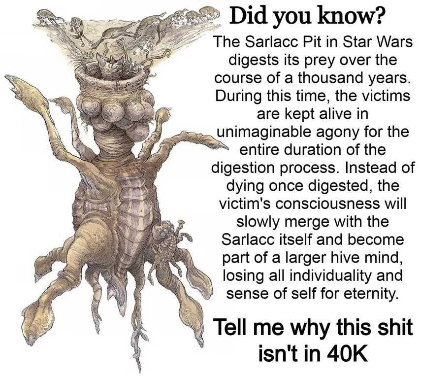 I will allow authors to take me on a ride and I will fill in gaps where needed. Frankly I have no reason to believe a Sarlacc in this world does any of that, how did the people in the star wars universe figure that out? Maybe it reads more like a boogeyman legend about a creature the Hutt’s use to execute people. I might add that our only in world evidence is boba fett getting out of one, not super scary. I’m just adding a bit of my own spice to the world because it’s been left open to me to do so. That’s fun!