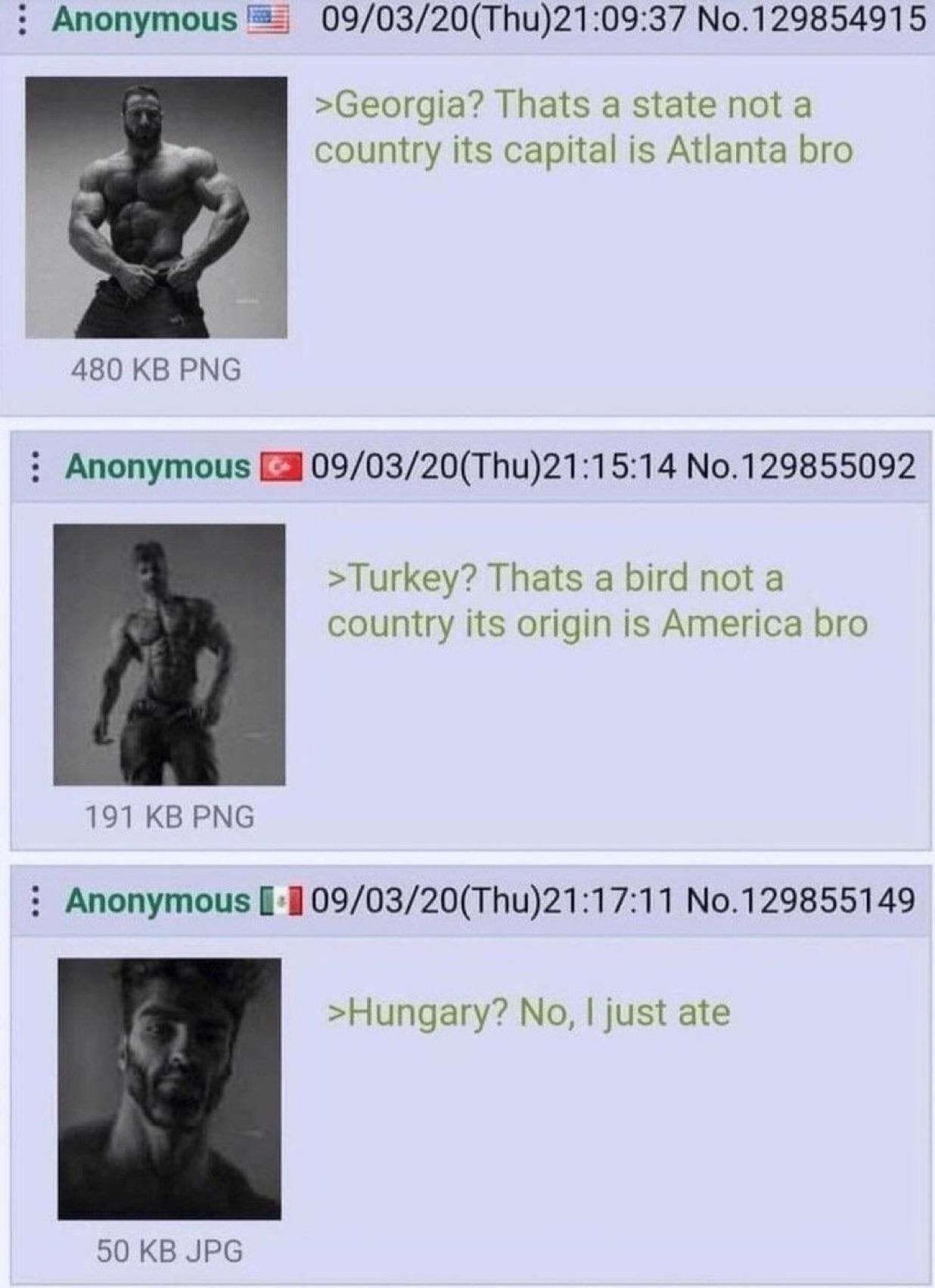 Greece? I like my pizza Greece-y, but not my fried chicken Iran? Nah, bro, this is ‘Murica, it’s not safe to run, I drive my truck everywhere instead Iraq? Of course I rack my weights after I’m done lifting bro