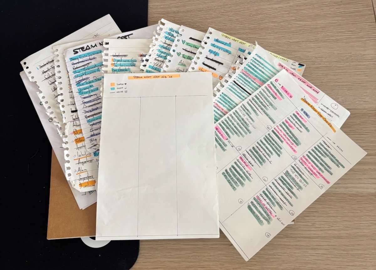 (seen on the picture attached) I have one sheet of A5 paper per edition, around 60 to 90 demos played every time, and notes written on the back, I keep notes of the demos I play, and highlight those that are interesting enough, those that I wishlisted, those that aren’t worth my time, etc. forgive the dirty mousepad lol