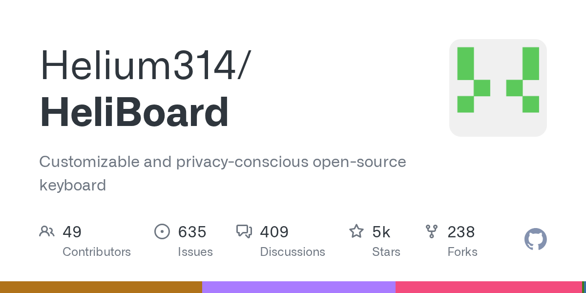 HeliBoard is a privacy-conscious and customizable open-source keyboard, based on AOSP / OpenBoard. Does not use internet permission, and thus is 100% offline.