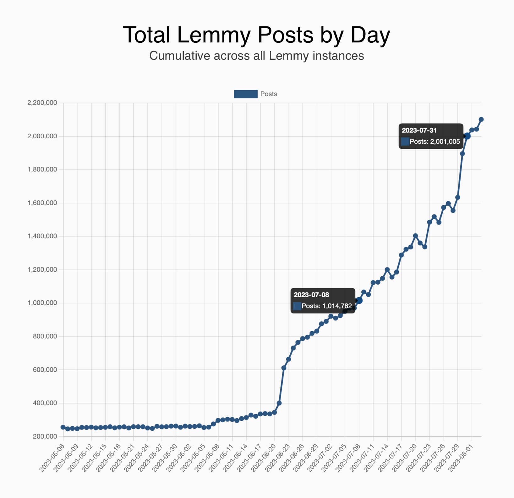 Paulius@lemmy.world to Fediverse@lemmy.worldEnglish · 2 years agoIt Took 23 Days for Lemmy Posts to Double from 1 Million to 2 Millionplus-squarelemmy.worldimagemessage-square0fedilinkarrow-up11
