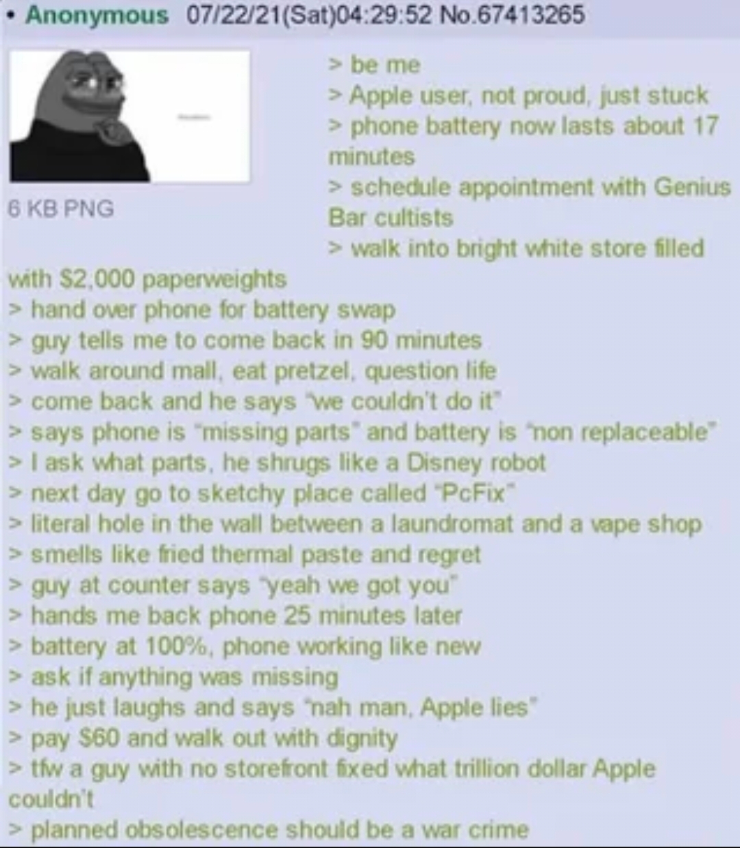 Zenoctate@lemmy.world to Greentext@sh.itjust.works · 4 months agoAnon describes apple's practices lemmy.worldimagemessage-square0fedilinkarrow-up11