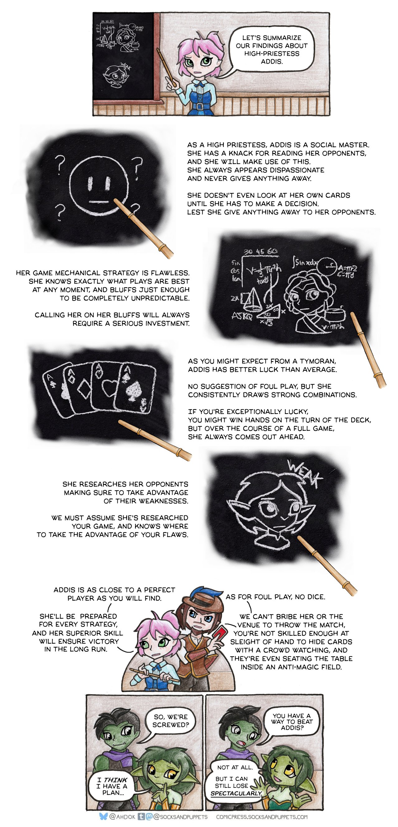 Probably the biggest problem is that the entire point of this match is to have Konsi play a high-stakes poker match under scrutiny, to prove that she legitimately has skill at the game, and doesn’t cheat. They’re staging this whole thing to head off accusations of foul play… Kidnapping your opponent and winning by default doesn’t exactly solve the problem!