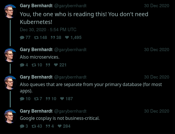Precisely, Gary Bernhardt has given a talk on ideology. I don’t think he’s precisely someone who thinks in absolutes. It’s just preaching that some stuff is (probably) used more than it should. I’ve seen way, way, way worse projects that over engineered things and made things slow and unmanageable, than the opposite. Of course, everyone has seen different things, and our perceptions are amplified and biased by that.